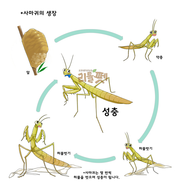 알집은 수백 개의 알로 이루어져있습니다. 사마귀는 가을에 산란하여 봄(5월~6월)에 알에서 깨어납니다.