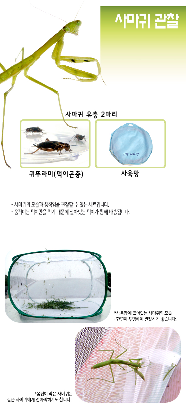 투명관찰병 3 개, 투명 사육망 1 개, 사마귀 2 마리, 먹이곤충 귀뚜라미 또는 메뚜기목 시설된 공간에서 살아있는 곤충 사료로 사육됩니다.