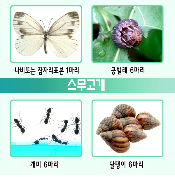 나비 표본 1 마리 또는 잠자리 표본 1 마리 공벌레 6 마리 이상 개미 6 마리 이상 달팽이 6마리